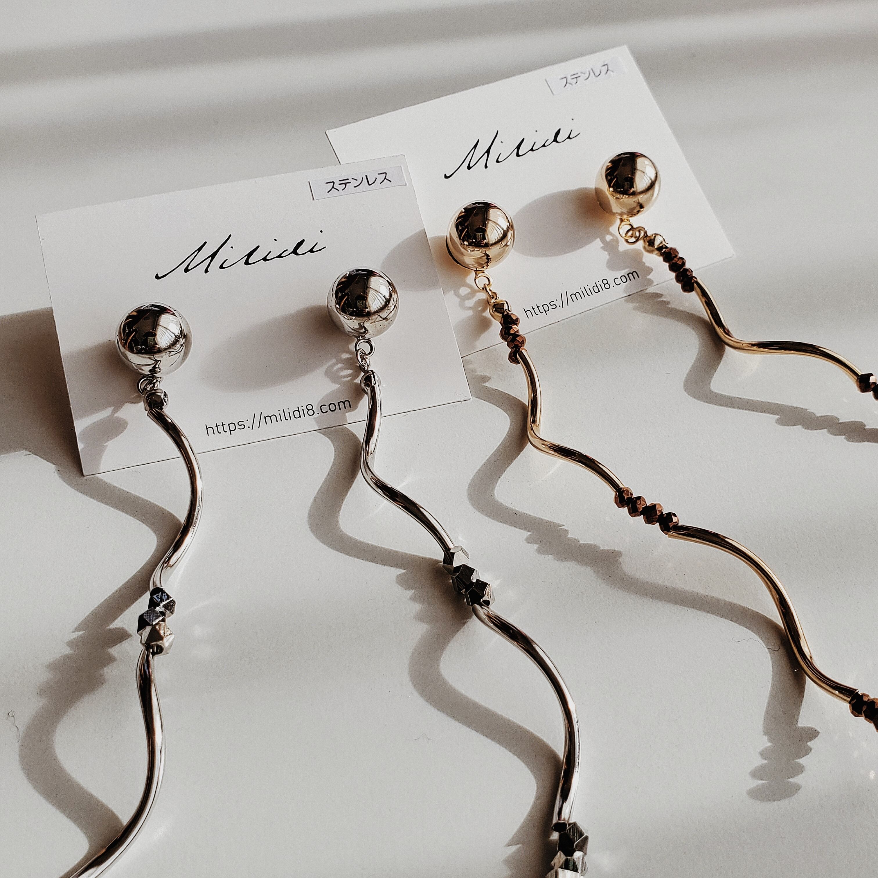 ウェーブパイプとカットビーズのロングピアス/イヤリング。