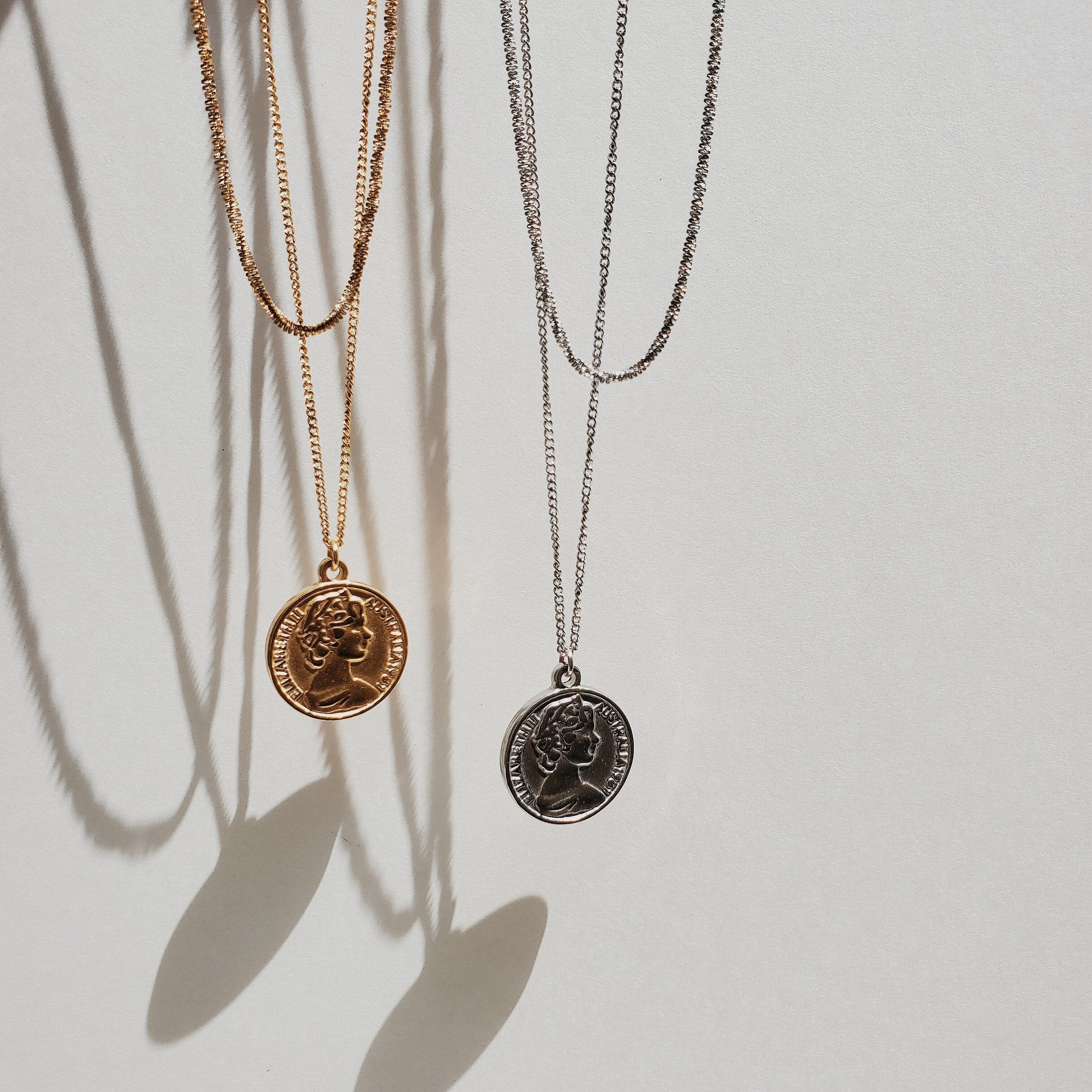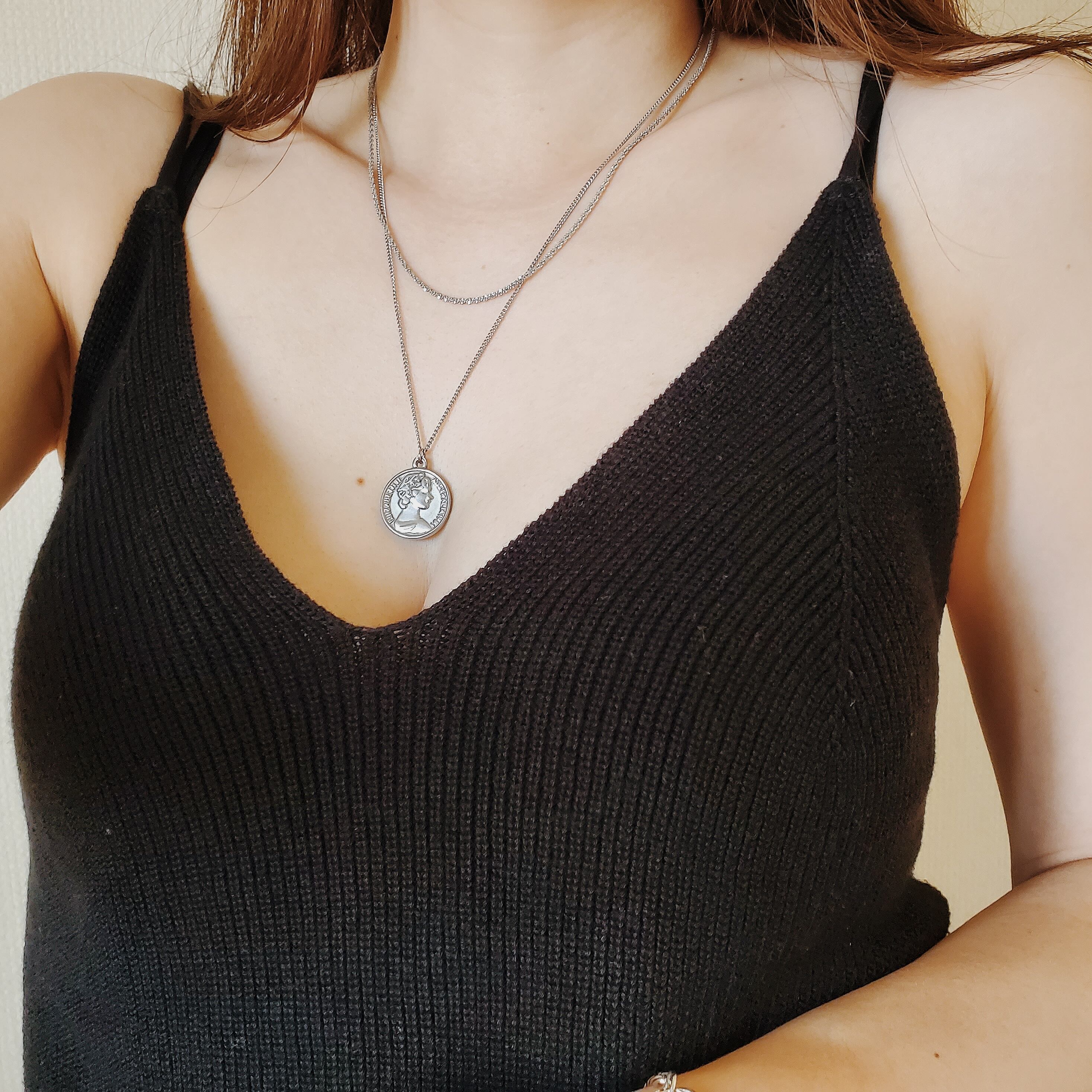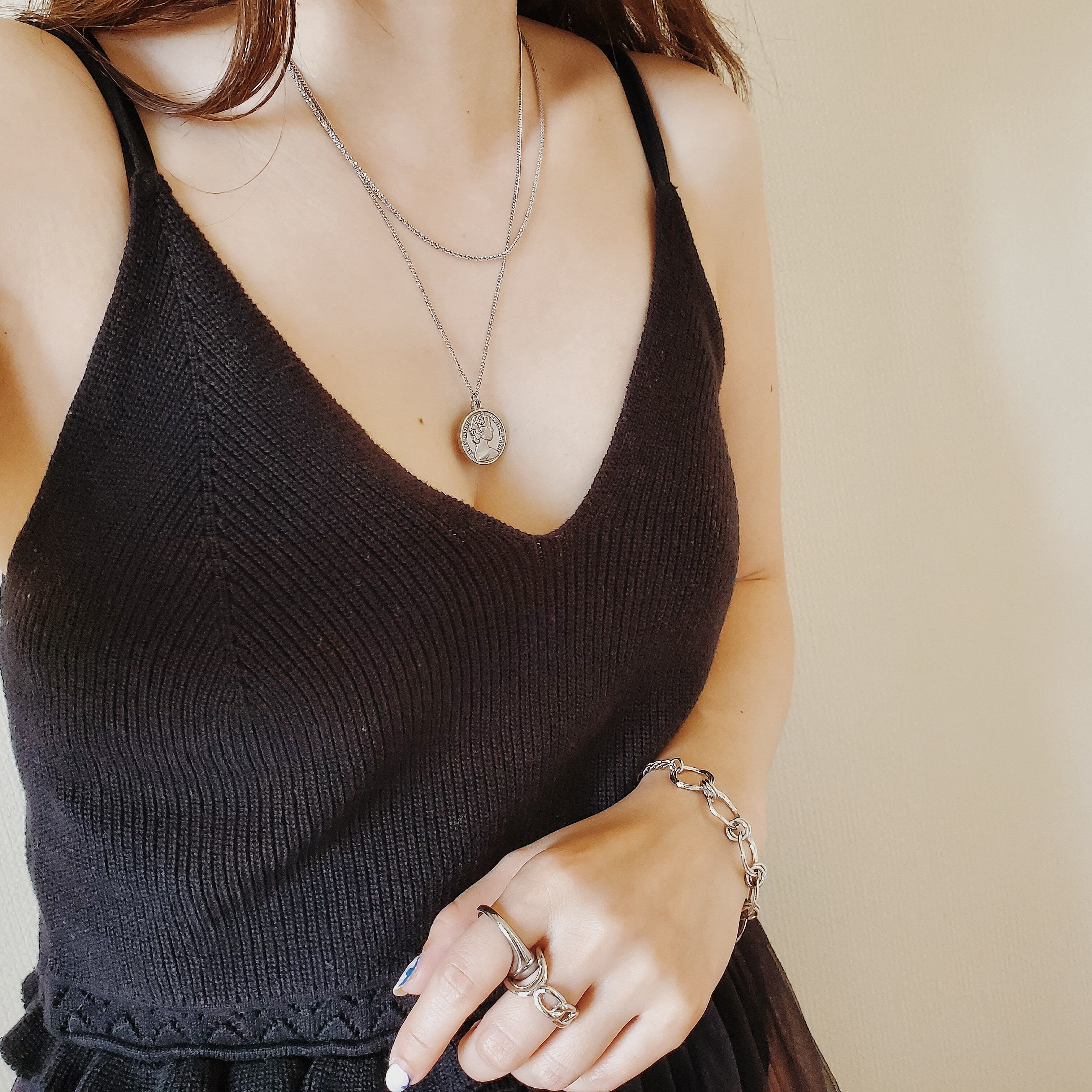 重厚感のあるコインチャームには、あえて細身のキヘイチェーンを合わせてみました。