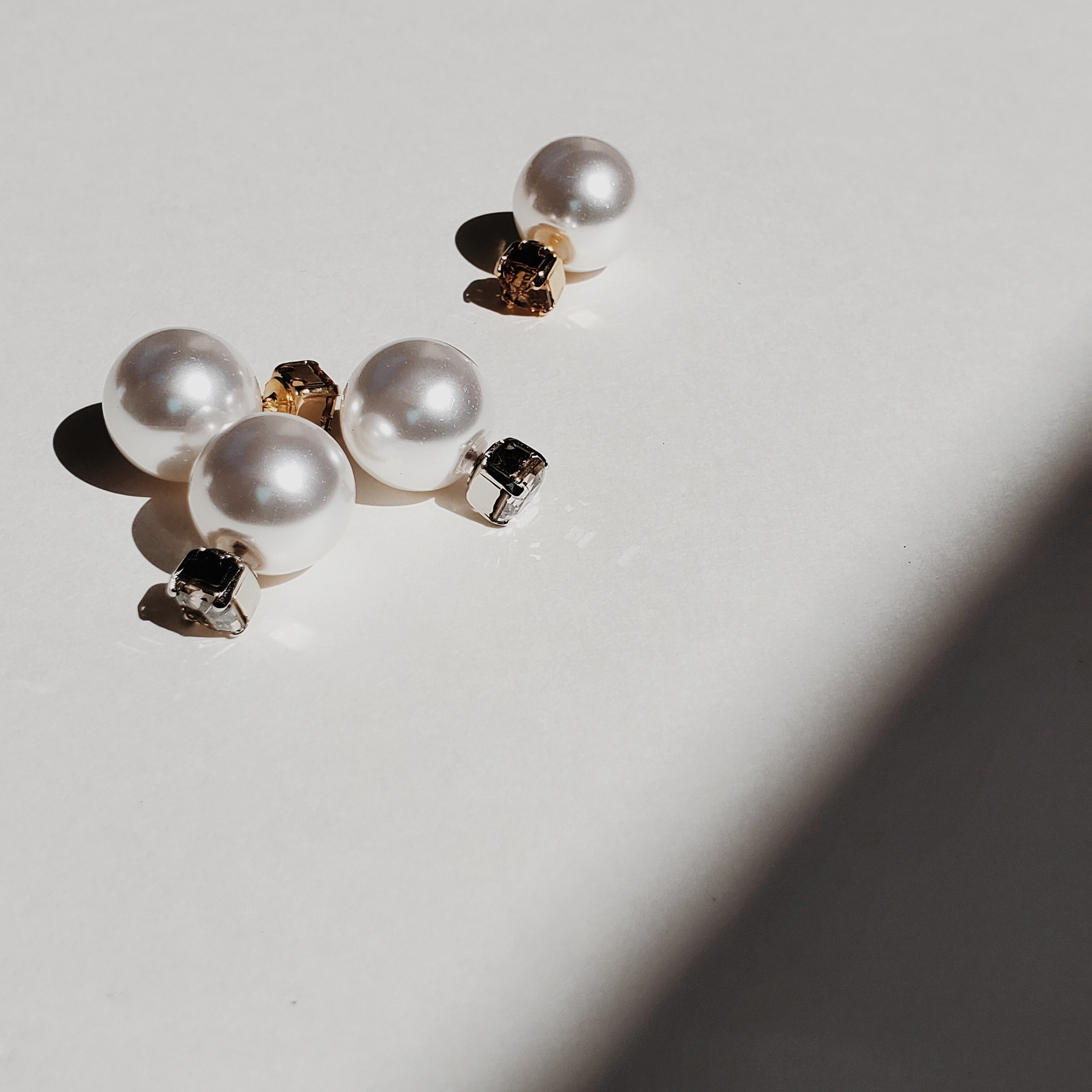 小ぶりながら、耳の後ろからパールがのぞくデザインが目を惹くビジューピアスです。
